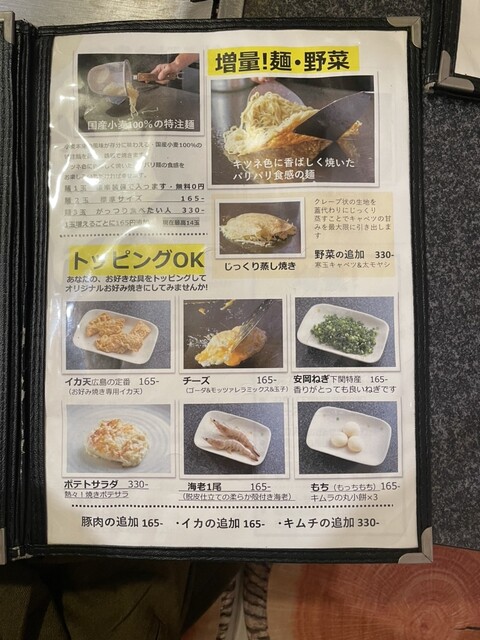 メニューを見るとまず、普通の豚玉が存在感薄い。。。周りのオーダーを聞いているとみんな海鮮ネギなんちゃらかポテサラなんちゃらばかりなんです。こちらは少しアレンジ広島風お好み焼き推しのお店なんです!
