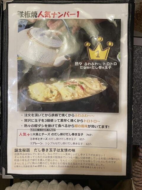 たまたま最後の一席にすぐに座れましたが、満席で次々にオーダーが来る宅配に対応にお忙しそうでした。時間がかかるかなぁと思いましたが、だし巻き卵は7分ほどで到着。メニュー表通りのビジュアル。ミルクレープのように折り重なっただし巻き卵が鉄板に入っていてその中に熱々のお出汁をかけて仕上げます。フワフワとツルツルの間の何とも言えない食感のだし巻き卵ですが、お出汁ともよく合っていてパクパク食べられます✨