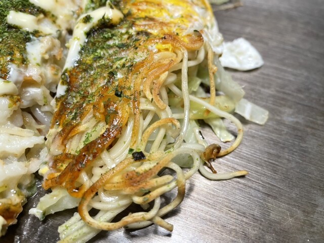 お好み焼きのパリパリ麺は、そうなんです!バーナーで焼き目をつけて香ばしく仕上げています。チーズの焼き上げも香ばしく、海鮮やポテサラとのコラボを楽しんでいただけて本当に嬉しいです。