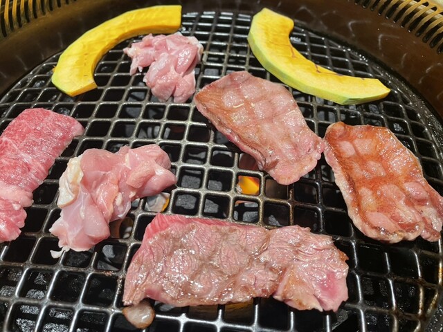上ハラミ、平戸牛カルビー、長崎和牛カルビー、豚カルビー、鶏、海老、ホタテ、焼き野菜
