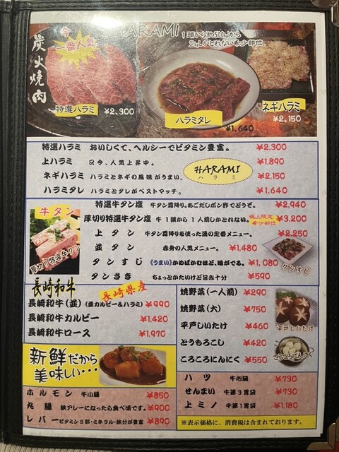 上ハラミ、平戸牛カルビー、長崎和牛カルビー、豚カルビー、鶏、海老、ホタテ、野菜。