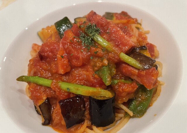 これもアスパラガス、茄子、ピーマン、ズッキーニなどのお野菜がたっぷり。野菜の美味しさがトマトソースのジューシーさを引き立ててさっぱり頂けます。
