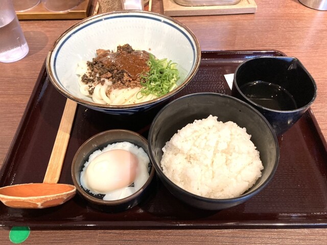 汁なし坦々うどん→温泉卵・追い飯付き。