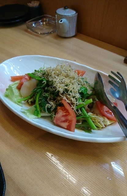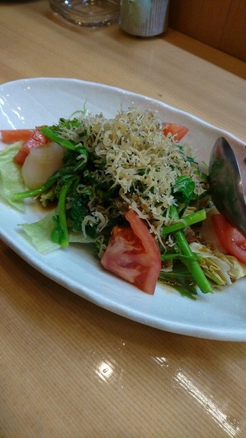 ちりめんじゃこ・トマト・ホタテ・青菜・レタス等乗った、豪華なサラダ。