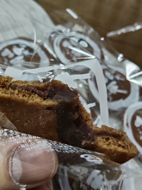 自宅で開封すると薄皮饅頭を薄く伸ばしたような見た目。食べると黒糖の甘さとアンコの味が絶妙で軽い。これなら2つ3つ食べられます。