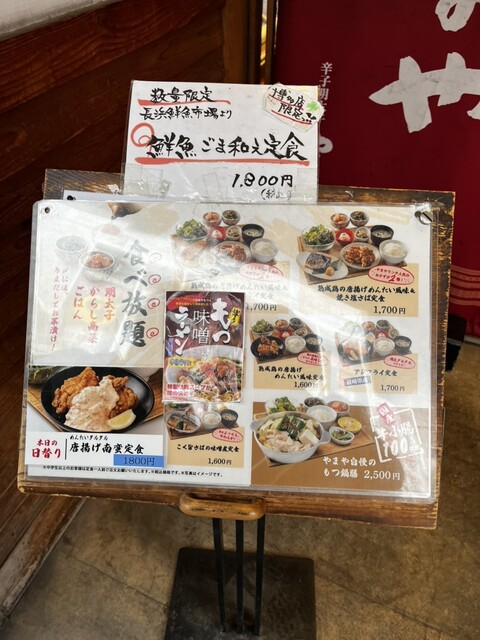 未だランチタイム内なのでここに決めました。やまや自慢のもつ鍋ランチ定食とアジフライ、唐揚げ定食を注文。ここのおすすめはなんと明太子と高菜の食べ放題ですよね。やまやの明太子を無限にいただけるのが嬉しいですね。ご馳走様でした。