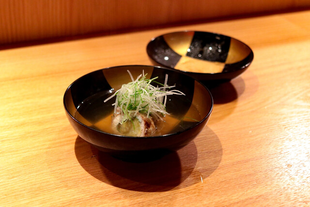 お椀はあわびと肝豆腐とトマトの揚げ出し