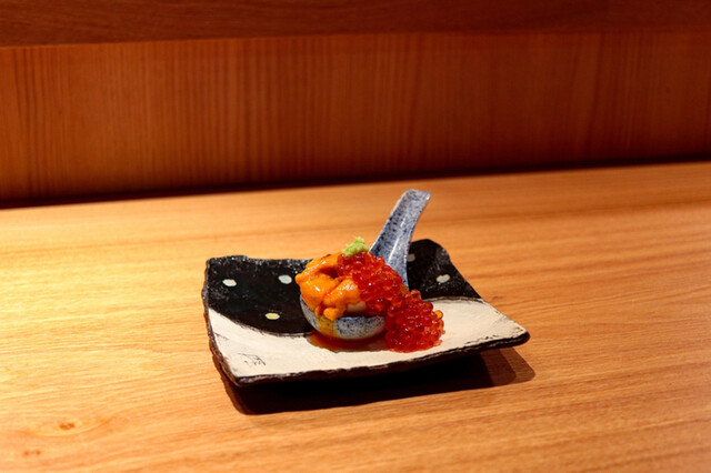 初めのメニューは雲丹オンザ煮卵!