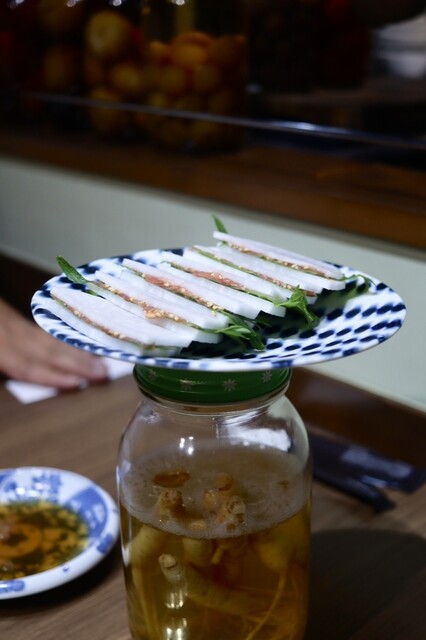 レバーはゴマ油塩と、ニンニクブレンド醤油の2つの味わいを楽しめる