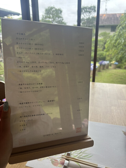 美しい庭園を臨む優雅な空間で、幻の葉山牛のすき焼きを堪能できた!