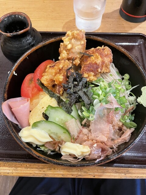 この時期食べたくなります。唐揚げ、ハム、だし巻き玉子、千切りキャベツ、トマト、きゅうり、ねぎ、かつお節など盛りだくさんの具!出汁をかけていただきます。