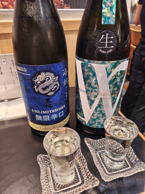 まずは日本酒と一品料理をいくつか、麺セットの寿司2貫を先にいただきました。