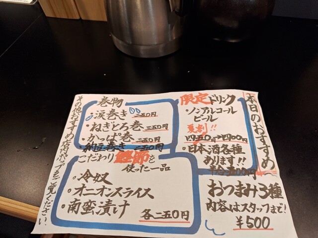 一品料理やお酒の種類も増えており、日本酒は熱燗も大丈夫とのこと。これから寒くなるので温まりそうです。