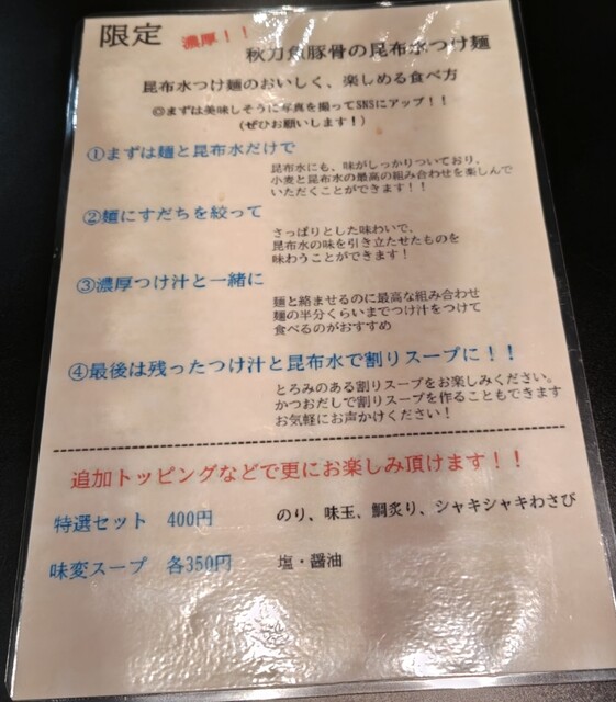 今度の限定は [秋刀魚の昆布水つけ麺]