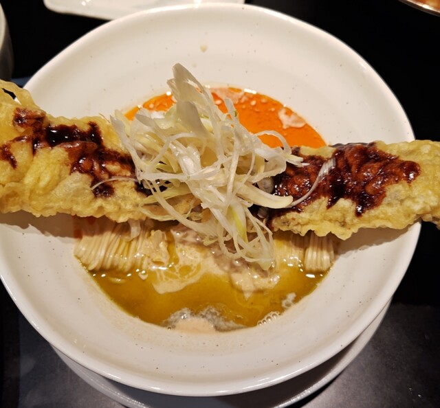 タンタンメン。麺と野菜の上に穴子天ぷらが1本乗ります。
