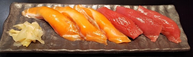 お寿司はワサビ入りで、醤油が塗ってあるので手間なく食べられます。シャリは小ぶりですが、ネタも新鮮で美味しいです。