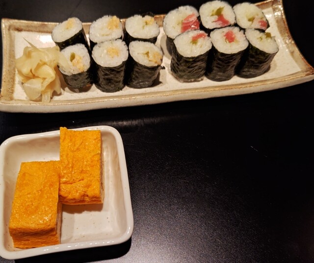 まずは南蛮漬けと巻物、セットのお寿司2貫で、日本酒を美味しくいただきました。