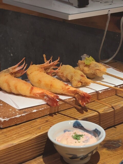 大海老さんは足から全てパリパリ食べれて美味しい☺️ 他の串カツは並んだ末、お任せにしましたが、鮎、鶏の柚子胡椒、豚カツ、海老つくね(あと1つ忘れた)どれも美味しい(*^^*)