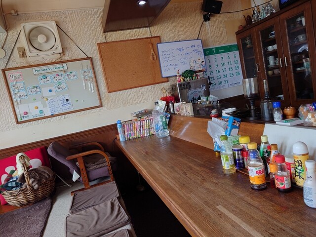 内観は 小ぢんまりしていて カウター席8席、小上がり4人掛けテーブル2卓、4人掛けテーブル1卓。