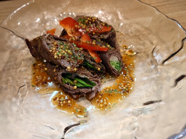 オーガニック牛の肉巻き赤身の牛の旨味強く 甘辛タレのオーガニック粒マスタードが良いアクセントで 美味しいです✨