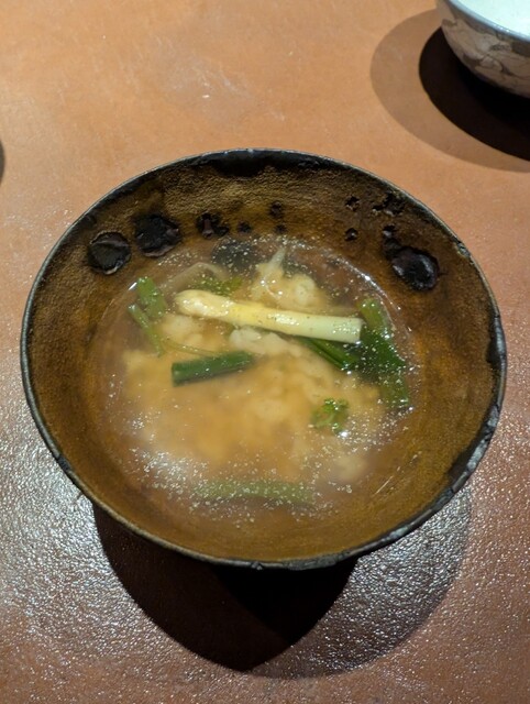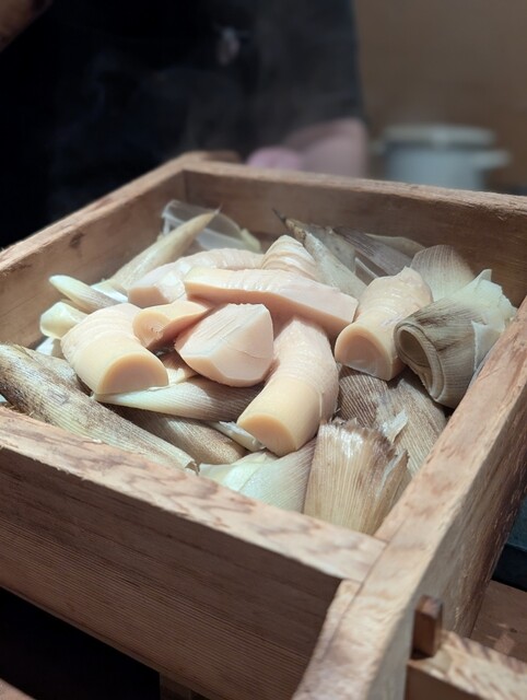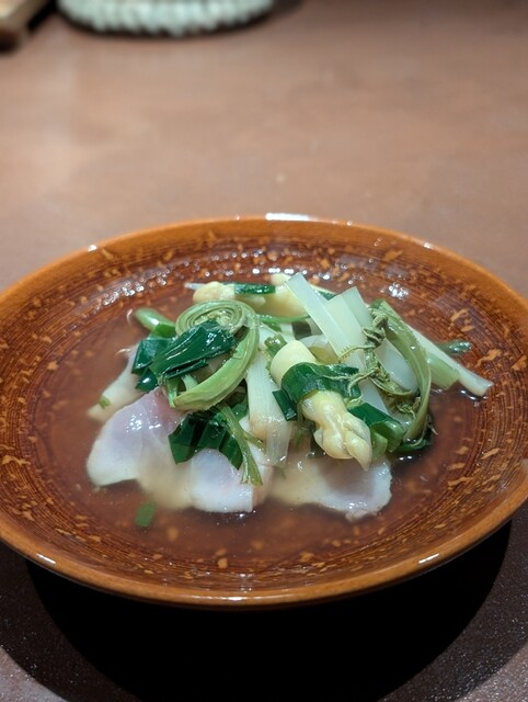 4. クエのしゃぶしゃぶ風。しじみ、あさりなどの出汁に山菜を入れた餡を、クエのお刺身にたらり。じんわり火が通ってしっとり頂ける。