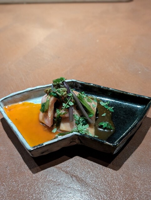 2. 中トロをわさび菜と明日葉で和えて木の芽を散らす、黄身酢で和える