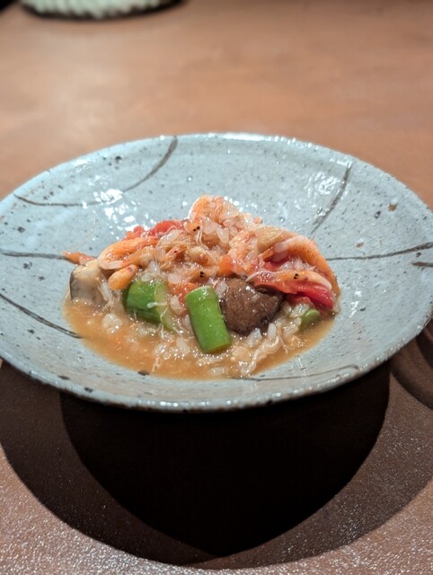 3. 蟹雑炊。雑炊のスープを作る過程でトマト、パプリカ、アスパラ、マッシュルームを入れて旨味を出し、ご飯と和えて雑炊に。桜エビを豪快に散らせば、アメリケーヌソースのような雰囲気な雑炊ができあがる