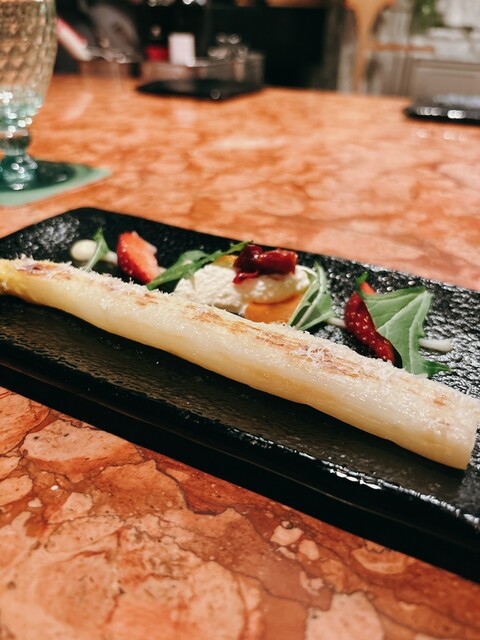 ホワイトアスパラガス(リコッタチーズ、ボッタルガ、トマトのコンフィ、イチゴ)