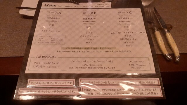 Cコース3300円+ビール605円×3杯(税込)でした。