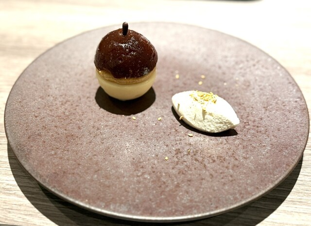 焼き菓子はリンゴに見立てたゼリーと、なんと日本酒の仙禽をアイスクリームにした模様。これがなんとも言えず美味しかった。