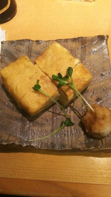 つまみは玉子焼きとかき揚げにしました。本日のお通しはフルーツポテサラですかね?キウイとあとなんか果物が入ってますが何だかわかりません、甘めですが美味しいです。