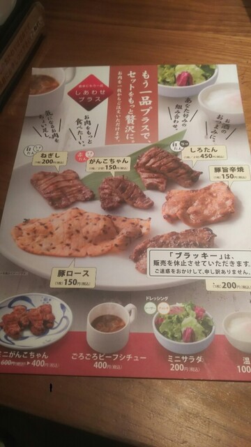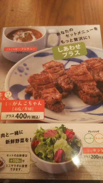 がんこちゃんは薄くて柔らかく、白タンは厚切りで歯応えアリ!です。トリプル・・は豚と牛カルビです。ねぎしではカルビをブラッキーと言うんだけど、なんでだろう?