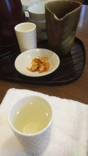 お酒追加ごとにおつまみ供されます。揚げそば→食べる?小魚→小松菜とじゃこ?→いぶりがっこ?です、たぶん(笑)。酒呑みならお酒だけでいいかもね。