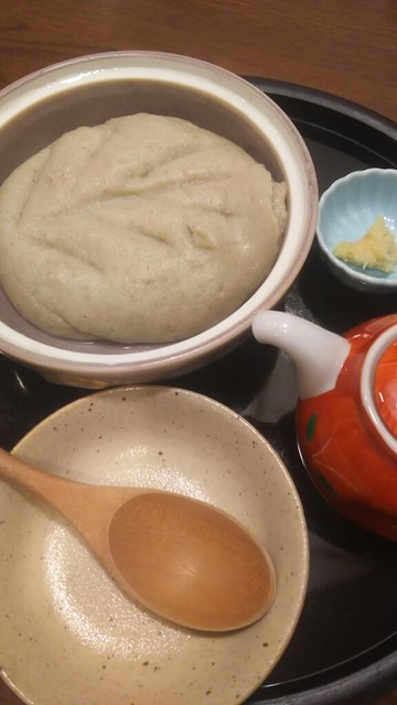 さて、とりあえずエビスビールとおつまみを頼みましょう。所謂蕎麦屋の定番のおつまみ、例えば玉子焼きなんてのは有りません。品数は少ないです。なんで例のごとくいつもの天ぷら盛り合わせとこちらは初のそばがきを。そばがきは生姜をのせてつゆをかけていただきます。相方が気に入ってくれたようで何よりです。次も頼みましょうかね(笑)。