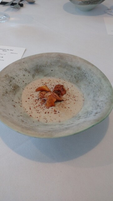菊芋とフォアグラソテーのホワイトソースのポタージュ・ココアパウダーかけ