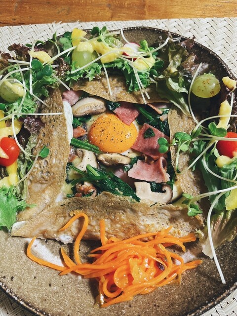 かぼちゃと栗のポタージュから始まり、ガレットは野菜たっぷりで、卵にほうれん草とベーコン、椎茸が入ってるのが珍しいと思いました。付け合わせのキャロットラペが、香辛料とビネガーが効いて美味しかったです。友人のキッシュはパイ生地が塩梅良く、中味も具沢山だったと教えてくれました。