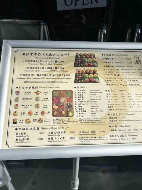 手鞠鮨12種・刺身3種・天ぷら3種のセット(4,300円)。
