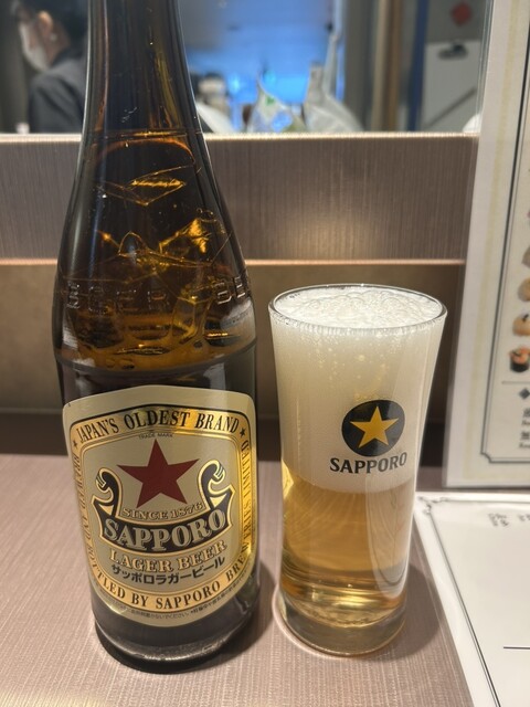 まずは赤星で乾杯(^。^) 日本酒も種類豊富で楽しい〜。