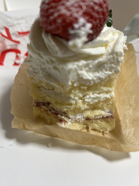 今回は迷いに迷って、最初に目に飛び込んできた苺のショートケーキをチョイス。大きな苺がドーンと乗り、白いお砂糖がふわっとかかった、見た目も映える可愛いケーキです。