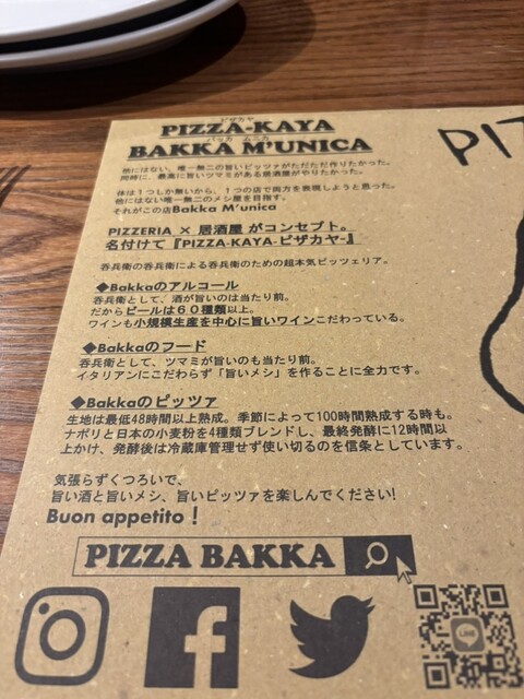日曜日の18時に予約して訪問すると、店内はほぼ満席。やはり人気店だけあって予約は必須だろう。お店のコンセプトはPIZZERIA×居酒屋、唯一無二の美味いピザと同時に最高に美味いつまみのある居酒屋とのこと。確かにメニューにはかなりの数のお酒が並んでいる。