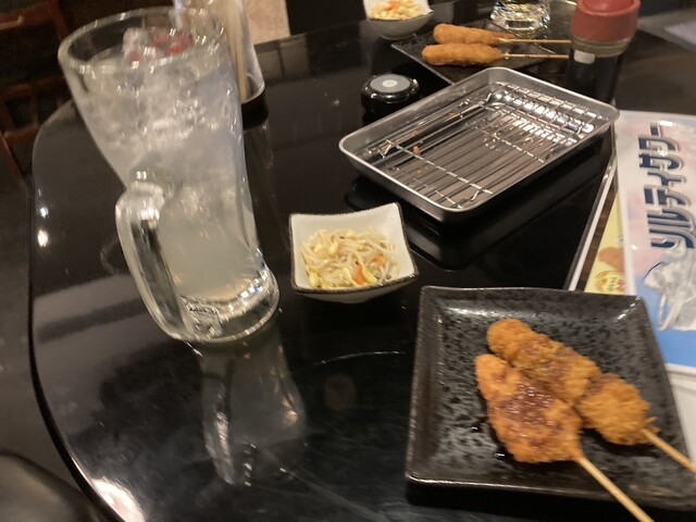 飲み放題を注文、特製ソース、ぼっかけ、唐揚げ、海鮮塩焼きそば、レモンサワー、生ビールアサヒスーパードライ、烏龍茶