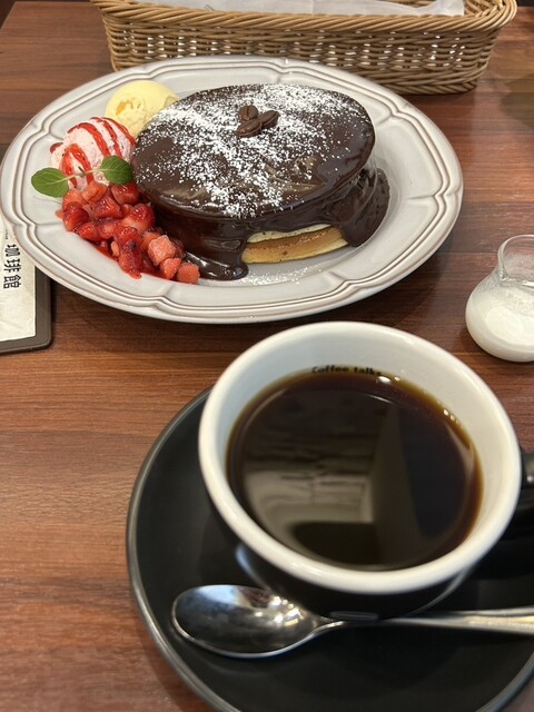炭火珈琲と期間限定のホットケーキ、とろける濃厚チョコレートホットケーキ〜ストロベリーホイップを添えて〜 1800円