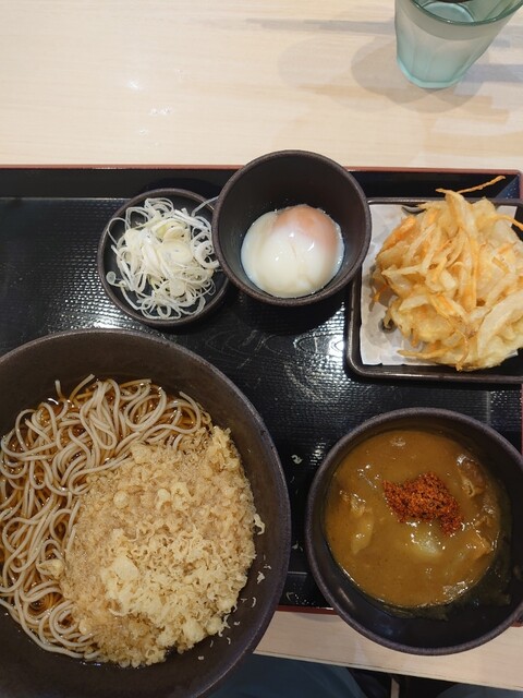 朝そば(温、野菜かき揚げ・温玉)+カレールー