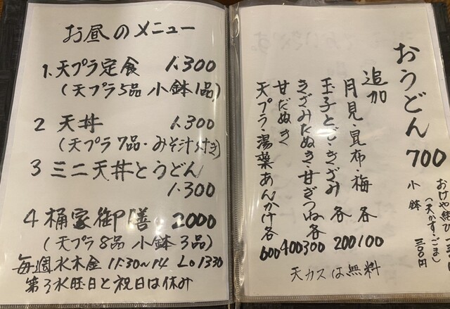 今ランチは平日水、木、金曜日11時半から営業されているそうです。今日はたまたま仕事が休みだったので丁度良かったです。メニューは2,000円の桶家御膳を注文!おかずはどれも上品な味でご飯の上には佃煮もふりかけてくれました。天ぷらは揚げたてでつゆと塩でいただきました。ホクホクサクサクの天ぷらは何個でも食べれそうでした。