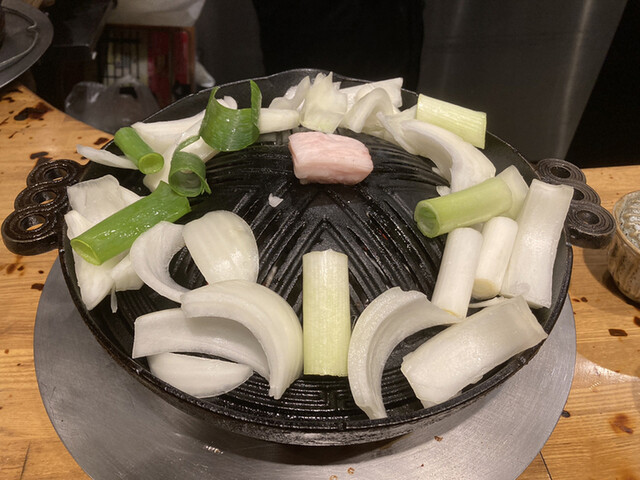 テーブルに格納された炭火鉢は万全の火加減で準備され、着席と同時に、最初のヤサイ(有料:ざく切り玉葱と長葱)がセットされ、成吉思汗鍋の頂点に脂身が置かれて、今夜のショーのスタートです!!