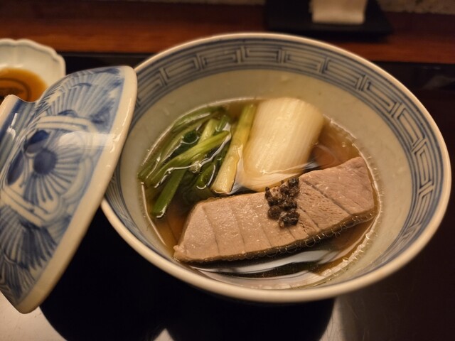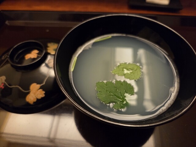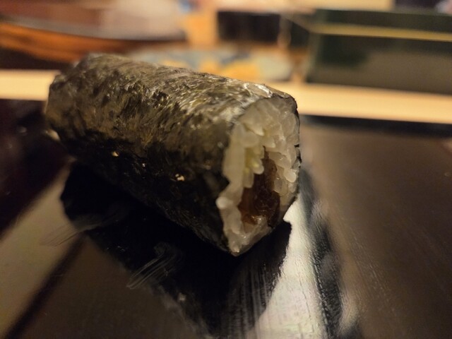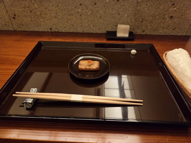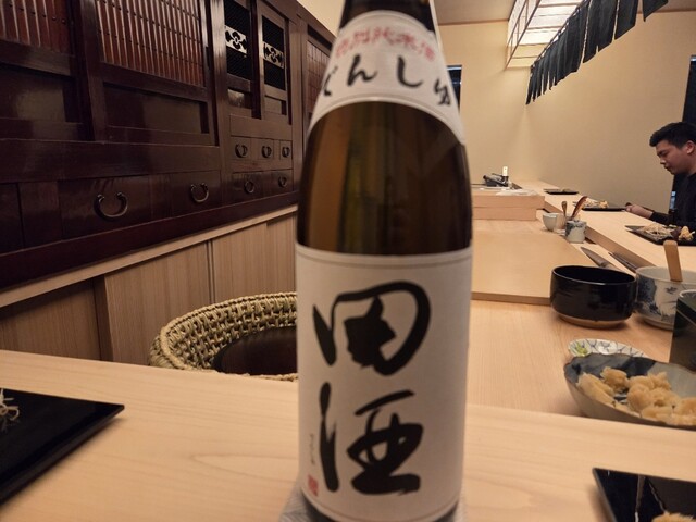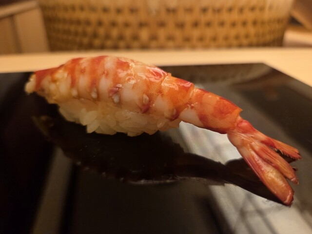 すきやばし次郎で11年の修行を積んだ親方。女将はなんとイギリス人。親方と女将の息もぴったり。中へ入ると目に飛び込んでくるのが漬け場の上にある深緑色の暖簾。奥には100年以上前の近江箪笥が置かれ、それに合わせて拭き漆仕上げにした重厚感のあるカウンターも素晴らしい。