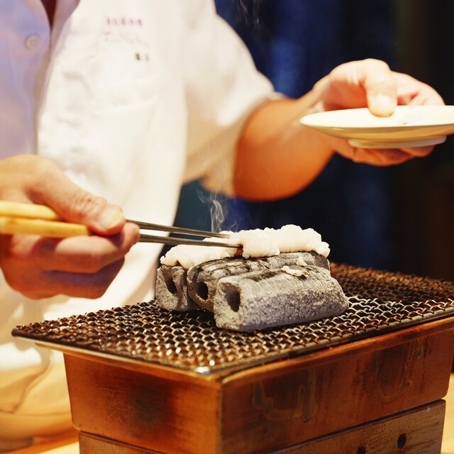 鱧をさっと炭で焼き、わさびと梅肉を加えて頂く。