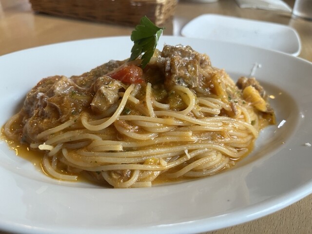 ランチはリーキやトマトやお肉のパスタをチョイス