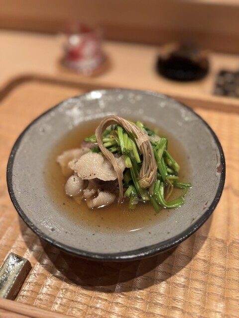 松茸の食感を色々と楽しめるような切り方や手の入れ方などが、まずは素晴らしいですね❤️ 細切れやら、千切りやら、薄めのスライス、厚めのスライス、縦にカットなどなど。それに、焼いたり、生でサラッとだったり、しゃぶしゃぶのようにベリーレアだったり、揚げたり、蒸したり、、、自由自在に素晴らしい素材を素晴らしい腕で、見事に仕上げられます。肉と合わせたり、魚と合わせたり、、、ミシュランの2つ星獲得の際、「自由な発想で食材を組み合わせる独自性」が評価されたとコメントされただけはありますね^_^
