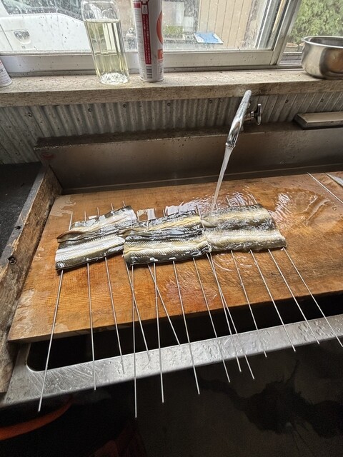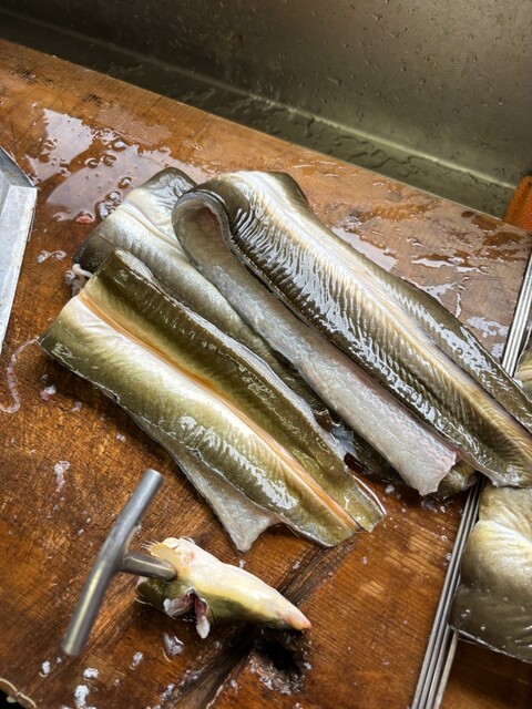 1匹は、丸々太ったかなりの特大サイズ!1匹は、黄金とまではいかないまでも濃厚な黄色のボディのなかなかのサイズ。1匹は、白焼に向いている緑がかったボディ色。今回は、その3匹(本)を調理していただきます。